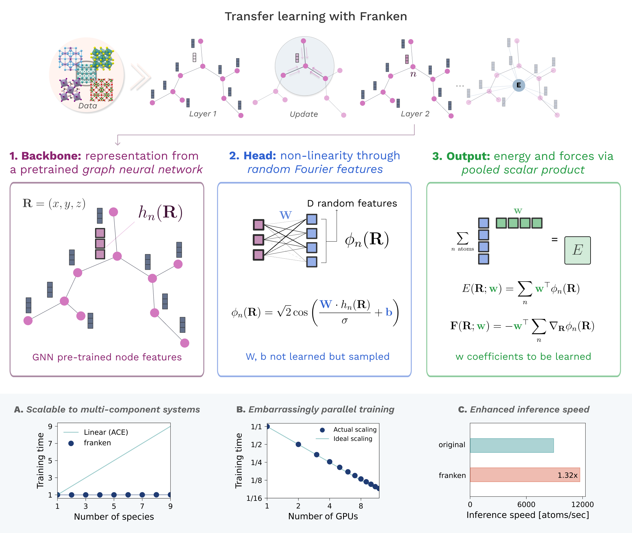 Training machine learning interatomic potentials that are both computationally and data-efficient is a key challenge for enabling their routine use in atomistic simulations. To this effect, we introduce , a scalable and lightweight transfer learning framework that extracts atomic descriptors from pre-trained graph neural networks and transfers them to new systems using random Fourier features — an efficient and scalable approximation of kernel methods. It also provides a closed-form fine-tuning strategy for general-purpose potentials such as MACE-MP0, enabling fast and accurate adaptation to new systems or levels of quantum mechanical theory with minimal hyperparameter tuning. On a benchmark dataset of 27 transition metals, outperforms optimized kernel-based methods in both training time and accuracy, reducing model training from tens of hours to minutes on a single GPU. We further demonstrate the framework’s strong data-efficiency by training stable and accurate potentials for bulk water and the Pt(111)/water interface using just tens of training structures. Our open-source implementation ( https://franken.readthedocs.io ) offers a fast and practical solution for training potentials and deploying them for molecular dynamics simulations across diverse systems.